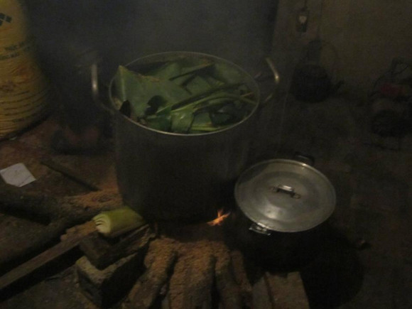 Công đoạn nhuộm gạo đã xong, để có những chiếc bánh chưng đẹp bày bàn thờ ngày Tết, người dân trong làng thường mời những người khéo tay về gói bánh cho gia đình mình. Khi những chiếc bánh vuông vắn, vừa vặn đã được gói xong những chiếc bánh được xếp vào nồi đểchuẩn bị luộc. Đây là công đoạn khá quan trọng, những chiếc bánh được xếp ngay ngắn vào nồi sau đó phải chèn bã lá nhuộm và lá dong vào xung quanh để cả nồi bánh không có chỗ nào trống. Nếu như cách luộc thông thường bánh cho vào nồi là bắc lên bếp nhưng nếu cho lá nhuộm vào bánh sẽ làm bánh thêm xanh còn nếu chèn không chặt thì khi sôi bánh sẽ bị bung khiến gạo chảy ra ngoài làm cháy nồi bánh.