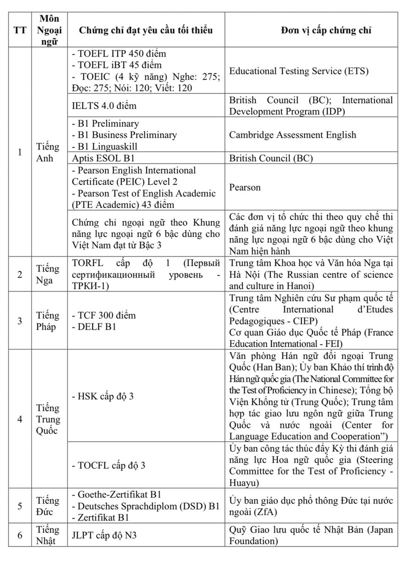 Theo đó, thí sinh có một trong các chứng chỉ trong danh sách trên hoặc các chứng chỉ ngoại ngữ được Bộ GD-ĐT công nhận tương đương với Khung năng lực ngoại ngữ 6 bậc dùng cho Việt Nam (đạt từ bậc 3 trở lên và có giá trị sử dụng đến ngày làm thủ tục dự thi) thì được miễn thi môn ngoại ngữ trong xét công nhận tốt nghiệp THPT năm 2025.