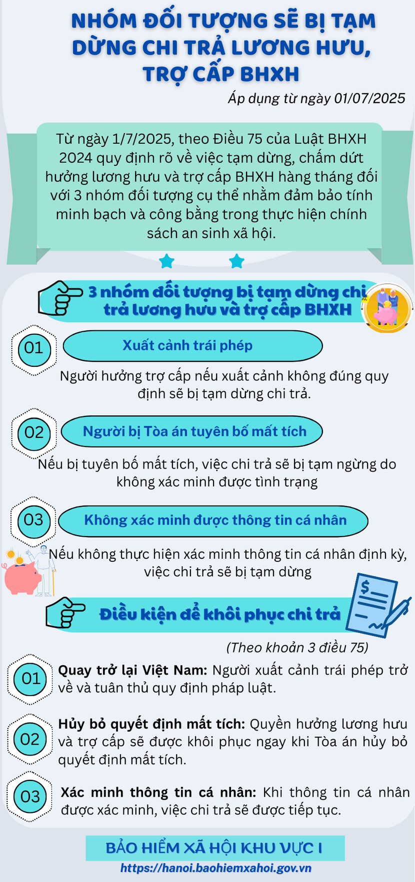 Bảo hiểm xã hội Khu vực I cho biết, từ ngày 1/7 tới, Luật Bảo hiểm xã hội 2024 quy định rõ về việc tạm dừng, chấm dứt hưởng lương hưu và trợ cấp bảo hiểm xã hội hàng tháng đối với 3 nhóm đối tượng.