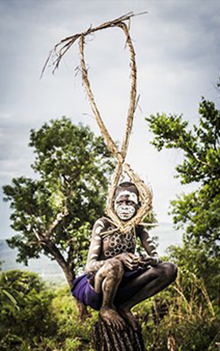 Seton phải mất ba ngày lái xe từ Addis Ababa để đến chụp ảnh bộ lạc Suri, cư trú tại làng Naregeer trong thung lũng Omo Rover - một khu vực xa xôi của Ethiopia, gần biên giới của Nam Sudan. Đây là bức ảnh đầu tiên trong ngày, bấm máy vào lúc 6h00, cậu bé bộ lạc Suri ngồi trên một thân cây khô giữa cánh đồng lúa miến.