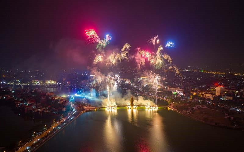 Bắn pháo hoa tầm cao tại hồ công viên Văn Lang, Phú Thọ kéo dài 15 phút. Màn bắn pháo hoa sẽ diễn ra sau chương trình nghệ thuật với chủ đề "Linh thiêng nguồn cội - Đất Tổ Hùng Vương" diễn ra từ 20h - 21h30 ngày 20/4/2021 (tức ngày 9/3 âm lịch) tại Hồ Công viên Văn Lang, TP.Việt Trì.