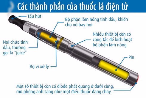 Một điếu thuốc lá điện tử (e-cigarette) hoạt động nhờ bộ pin lithium, có một ống đổ đầy chất lỏng nicotine và một buồng bay hơi. Khi rít “điếu” thuốc, bộ pin sẽ cấp điện cho thiết bị để đun nóng chất nicotin và làm nó bay hơi để người dùng hút vào miệng như điếu thuốc lá thông thường. Hàm lượng nicotine sẽ thay đổi từ 0 đến cực cao hoặc 24 đến 36 mg/ml khí thở.