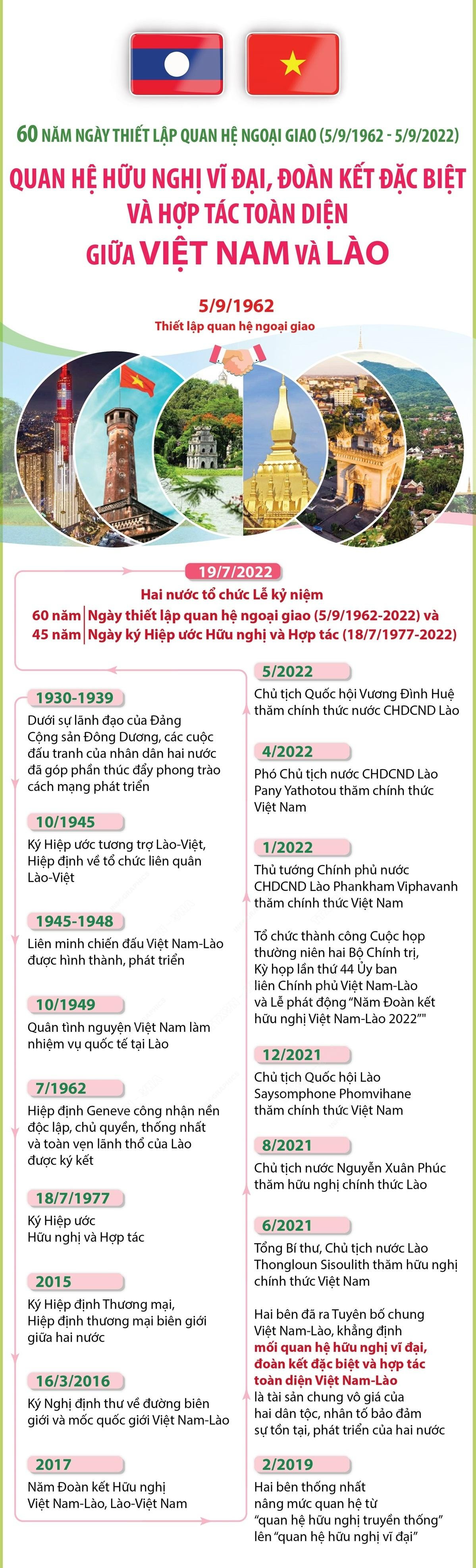 Việt Nam và Lào những ngày này diễn ra các hoạt động phong phú, đầy tự hào, ý nghĩa, thiết thực kỷ niệm trọng thể 60 năm Ngày thiết lập quan hệ ngoại giao giữa hai nước (5-9-1962/5-9-2022) và 45 năm Ngày ký Hiệp ước Hữu nghị và Hợp tác Việt Nam - Lào (18-7-1977/ 18-7-2022). Ðây là những sự kiện quan trọng được tổ chức trong khuôn khổ Năm Ðoàn kết Hữu nghị Việt Nam - Lào 2022 nhằm tiếp tục khẳng định mong muốn của các thế hệ lãnh đạo và nhân dân hai nước đưa quan hệ hữu nghị vĩ đại, đoàn kết đặc biệt, hợp tác toàn diện Việt Nam - Lào ngày càng phát triển, đi vào chiều sâu, thiết thực và hiệu quả.