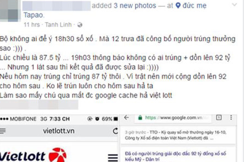 Bên cạnh đó, một chi tiết nhỏ khác cũng được facebooker N.T.D tìm ra: "Bộ không ai để ý 18h30 mới công bố kết quả mà 12h trưa đã có người trúng thưởng sao. Lúc chiều là 87,5 tỷ, 19h03 thông báo không có ai trúng và dồn lên 92 tỷ.