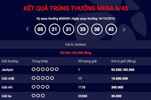 Cụ thể, ngày 16-10, trang chủ của Vietlott, đơn vị phát hành xổ số kiểu Mỹ tại Việt Nam đã thông báo có một người trúng giải độc đắc hơn 92 tỷ đồng trong kỳ quay này. Theo đó, tại kỳ quay số mở thưởng thứ 39 kết thúc lúc 18h30 tối ngày 16-10-2016 đã xác định được bộ dãy số trúng thưởng là: 05-21-31-33-38-42.