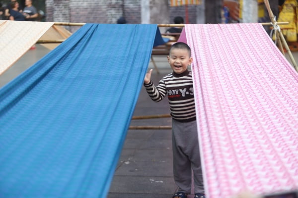 Một em bé thích thú với không gian tái hiện về quy trình phơi lụa