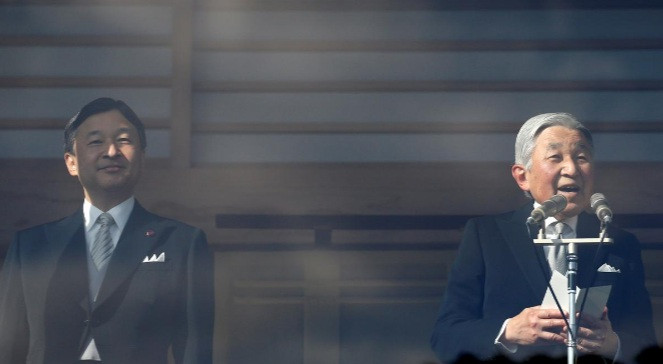 Nhật hoàng Akihito, với Hoàng Thái tử Naruhito bên cạnh, gửi lời chúc mừng năm mới tới công chúng vào ngày 2-1-2017