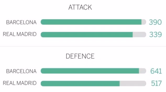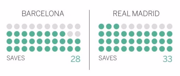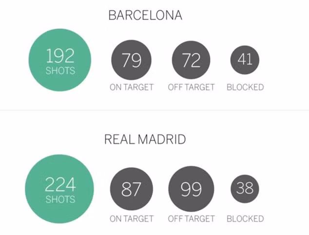 Barcelona đang cho thấy khả năng dứt điểm hiệu quả hơn so với Real Madrid. Họ dứt điểm ít hơn, 32 lần so với “Kền kền trắng”, nhưng tỷ lệ ghi bàn tốt hơn 3% so với Los Blanco.