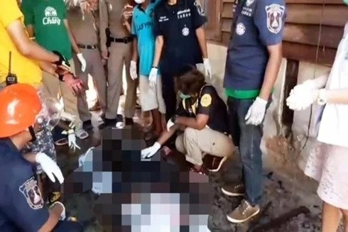 Cảnh sát, nhân viên cứu hỏa và y tế xem xét thi thể Nisachol Sawasdiwong