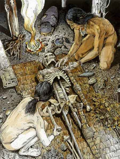 Ban đầu, họ lấy hết nội tạng và não ra rồi nhồi đất sét vào bụng xác chết. Cũng có khi họ sử dụng sợi dây hoặc lông động vật nhồi vào bụng, hộp sọ. Tro quặng mangan đen được bôi lên các mảnh xương. Xác ướp được mặc những chiếc áo đan bằng cây lau sậy, quấn bằng dây thừng, hoặc đặt trong hòm gỗ. Việc này giúp chúng có thể giữ nguyên hình dạng trong quá trình di chuyển trước khi được chôn cất. Bằng chứng là nhiều xác ướp được phát hiện vẫn giữ được cấu trúc khá vững.