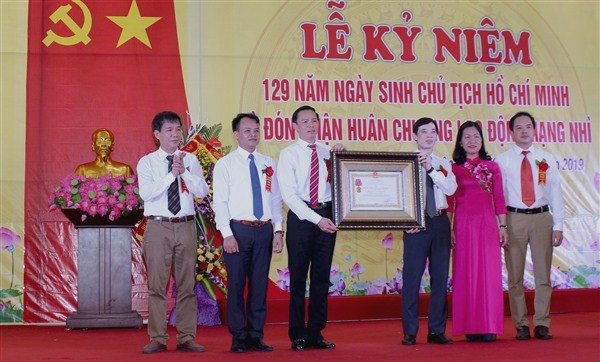 Bí thư huyện ủy Nguyễn Huy Việt trao Huân chương Lao động hạng Nhì cho đại diện lãnh đạo xã Đình Xuyên