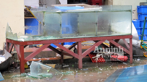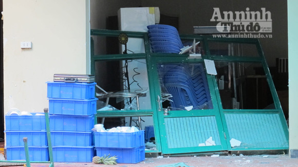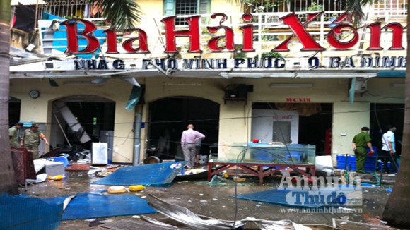 Tại hiện trường, toàn bộ bàn ghế, biển bảng, bếp nướng và các bể kính chứa hải sản… đều bị vỡ tung. Nhiều bàn ghế và biển quảng cáo của nhà hàng này bị sức ép thổi tung, bay cắt ngang phố Vĩnh Phúc, lao thẳng sang nhà dân bên đối diện.