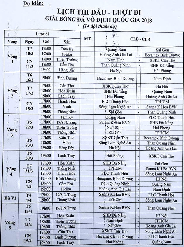 Theo kế hoạch, V-League 2018 sẽ khởi tranh vào ngày 10-3 và kéo dài đến ngày 29-9. Giải hạng Nhất diễn ra từ ngày 21-4 đến 22-9. Cúp quốc gia sẽ bắt đầu từ 15-4 và kết thúc vào 7-10.