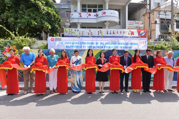 Các đại biểu cắt băng khánh thành tranh gốm Đài Loan trên Con đường gốm sứ