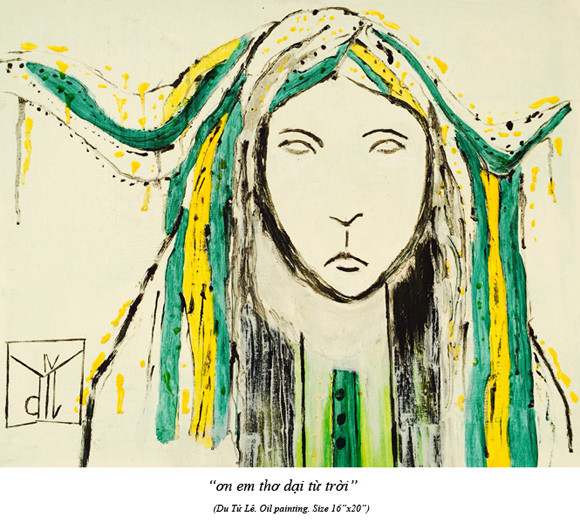 4. Du Tử Lê chia sẻ, trong đời ông có rất nhiều nỗi buồn và cả niềm vui. Có những thứ sẽ song hành cùng ông cho tới lúc nhắm mắt xuôi tay và lần trở về Hà Nội vào đúng mùa hè này, ra mắt tập sách “Giỏ hoa thời mới lớn”, được bạn văn chúc mừng, được độc giả yêu quý chào đón sẽ là một xúc cảm đẹp để ông nâng niu đến tận phút cuối cùng của cuộc đời. Hơn 70 tuổi ông còn viết không? Ông vui vẻ, viết chứ, ông vẫn sẽ viết như là một cách để trả ơn cuộc đời, như một sự cống hiến. Nếu bây giờ ông đã thỏa mãn với những gì mình có được trong văn chương thì điều đó chẳng khác nào ông gian lận, nợ nần xã hội. “Tôi sẽ vẫn viết, còn có ra gì không thì không biết” - ông cười hồn nhiên. Không chỉ viết, mấy năm gần đây Du Tử Lê còn vẽ tranh. Ông đùa, hơn 70 tuổi, tôi là nhà thơ già nhưng là họa sĩ trẻ. Người kiên quyết xui ông vẽ là…vợ ông. Bởi lúc buồn, ông vẫn thường có thói quen vẽ nghệch ngoạc vào giấy. Khi đó, vợ ông lặng lẽ thu dọn những thứ vẽ chẳng ra vẽ kia để cất đi. Rồi bà dẫn ông đến gặp một họa sĩ nhờ tư vấn. Rồi ông vẽ thật, mà tranh của ông cũng rất thơ. Ngày 22-6 này, ông có một cuộc triển lãm ở Atlanta- Mỹ.