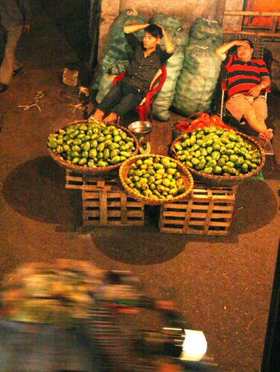 Hàng trăm, hàng ngàn lượt xe ra vào. Dòng người bốc vác tấp nập, nối đuôi nhau chuyển những thùng hàng lớn vào trong chợ cho các tiểu thương. Tiếng động cơ xe xen lẫn tiếng mua bán ì xèo. Một thanh niên gò lưng kéo những chiếc xe hàng nặng chĩu các thùng vải thiều. Một phụ nữ trung tuổi rảo bước với đôi quang gánh hướng về chiếc xe đầy ắp các thùng hoa quả chờ vận chuyển. Xen lẫn những giọt mồ hôi của những người bốc vác, vận chuyển hàng hóa ở chợ Long Biên, chúng tôi bắt gặp cảnh nhiều người tranh thủ chợp mắt trước buổi chợ sớm.