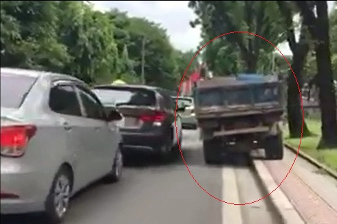 Chiếc xe tải vi phạm như thể... "làm xiếc" trên phố Kim Mã (khoanh đỏ, ảnh cắt từ clip)
