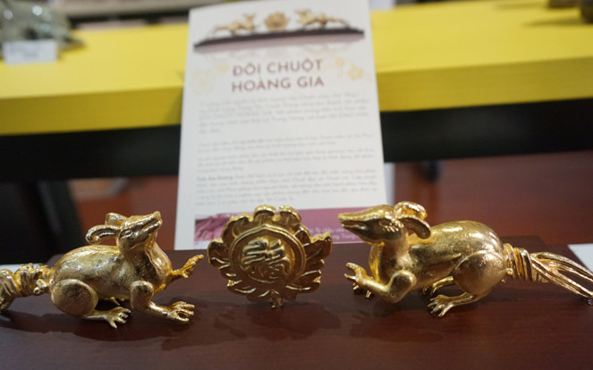 Nối tiếp mạch đi này, tại triển lãm, người xem còn bắt gặp vật phẩm Chuột hoàng gia, khai thác ý tưởng từ cặp chuột thời Lê chạm khắc gỗ trên vì kèo làng Trùng Hạ - Ninh Bình. So với nguyên bản, phần lớn các thiết kế của bản gốc được giữ trọn vẹn, chỉ thay đổi một số chi tiết nhỏ. Cặp chuột chầu vào chữ Phúc với mong ước hạnh Phúc tròn đầy, cũng là lời chúc ý nghĩa mà triển lãm Con giáp của tôi dịp Tết Canh Tý 2020 mang đến mọi gia đình.