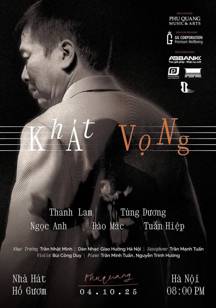 | Đêm nhạc "Khát vọng" do gia đình nhạc sĩ Phú Quang tổ chức, nằm trong chuỗi những hoạt động thường niên với mục đích bảo tồn và phát triển những di sản mà ông để lại. Chương trình với sự tài trợ của GG Corporation - tập đoàn về giải pháp cuộc sống chất lượng cao, quy tụ dàn nghệ sĩ thân thuộc với những đêm nhạc Phú Quang suốt nhiều năm như: NSND Thanh Lam, Tùng Dương, Ngọc Anh, Đào Mác và Tuấn Hiệp, |