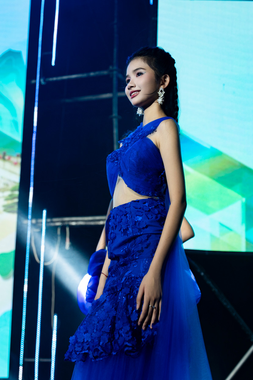 Vì vậy mỗi bộ trang phục được sáng tạo giống như “làn sóng thời trang”, khi thì nhẹ nhàng như thủy triều, lúc lại mạnh mẽ, kiêu hãnh như con sóng lớn vươn mình giữa biển khơi. Còn sắc xanh chủ đạo mang đến cảm giác thanh mát, thuần khiết nhưng cũng đầy chiều sâu – như chính tâm hồn của những người phụ nữ mà nhà thiết kế Châu Loan muốn tôn vinh. Đặc biệt, chất liệu được chị lựa chọn để gửi gắm thông điệp và cảm xúc cho bộ sưu tập này là lụa cao cấp, sequin ánh biển và voan mềm, giúp tạo nên hiệu ứng chuyển động uyển chuyển như dòng nước. Đi kèm với đó là những đường cắt tinh tế, những chi tiết đính kết công phu cùng sự phối hợp màu sắc hài hòa, góp phần thổi hồn vào từng bộ trang phục, khiến người xem như đang được khám phá sự kỳ ảo giữa lòng đại dương.