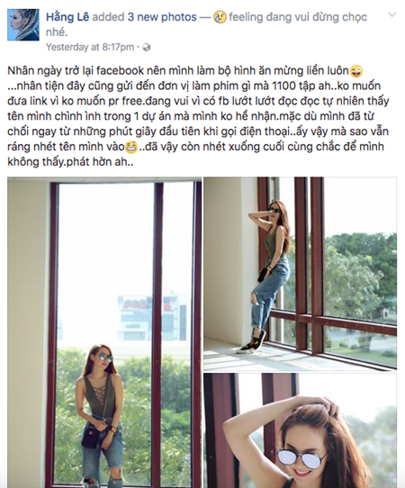 Bên cạnh đó, Minh Hằng cũng cho biết cô rất bực mình khi mình bị mang ra quảng bá cho một dự án mà bản thân không hề có mặt: “Tôi không hiểu vì sao một ekip sản xuất làm việc chuyên nghiệp lại có định hướng truyền thông như vậy, sử dụng tên tuổi của người khác mà không cần phải xin phép? Tôi khẳng định mình không tham gia vào bộ phim đó, và rất xin lỗi những khán giả yêu mến mình đã trót xem, tin vào những thông tin được đăng tải vừa qua về bộ phim này.”