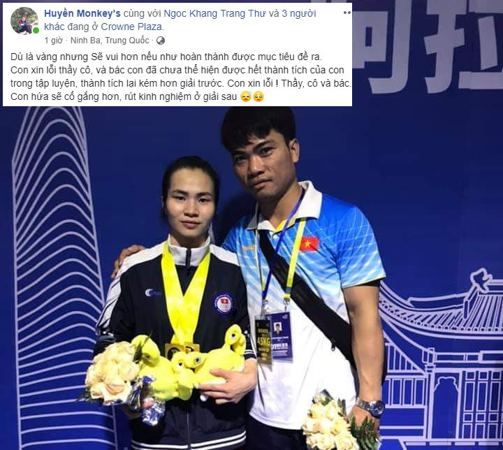 "Thành tích giải châu Á lần này, dù là 3 HCV nhưng thông số thua giải cúp thế giới vừa qua, số lần thực hiện (nâng tạ-pv) thất bại nhiều hơn", Vương Thị Huyền chia sẻ thêm về lời xin lỗi trên trang cá nhân.