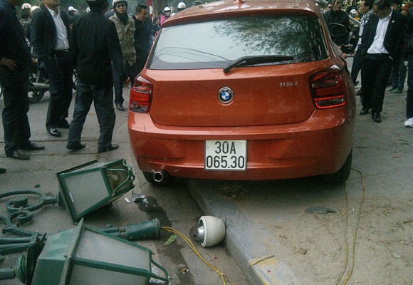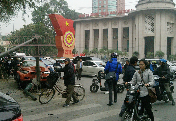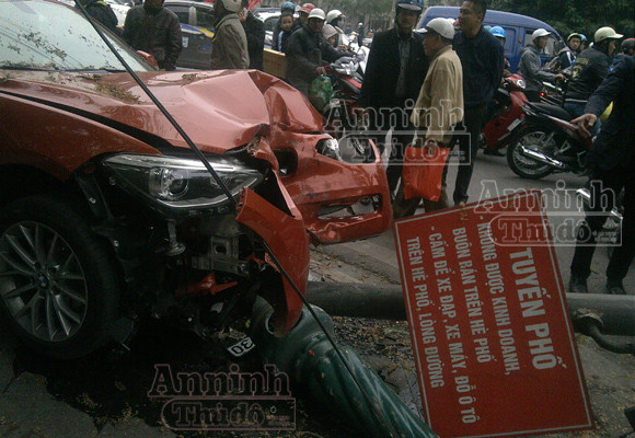 Một số người chứng kiến vụ tại nạn cho biết, vào thời gian trên, Một nữ thanh niên điều khiển ô tô mang BKS 30A-065.30 đã liên tiếp đâm vào xe mô tô nhãn hiệu Honda mang BKS 29B1-429.00 do người đàn ông điều khiển chở một người đàn ông khác nữa (chưa rõ danh tính người hai ngươi đàn ông này), rồi đâm vào cột đèn giao thông. Hậu quả nữ thanh niên điều khiển xe ô tô mang BKS 30A-065.30 và người đàn ông điều khiển chiếc xe Honda mang BKS 29B1-42900 bị thương nặng, được đưa đi bệnh viện cấp cứu. Chiếc xe ô tô chiếc xe máy bị hư hỏng nặng, một số bộ phận tung ra ngoài, cột đèn giao thông bị đổ, camera giao thông bị hỏng gãy rời khỏi cột đèn.
