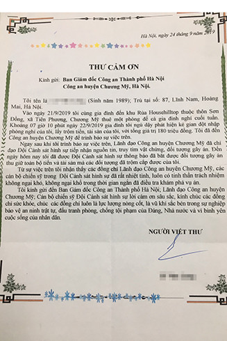Sáng hôm sau, chủ nhân của số tài sản bị Thoại lấy trộm là anh Lê V.L, SN 1989, trú tại quận Hoàng Mai, Hà Nội cùng gia đình tỉnh dậy, phát hiện tài sản bị mất đã đến CAH Chương Mỹ trình báo.
