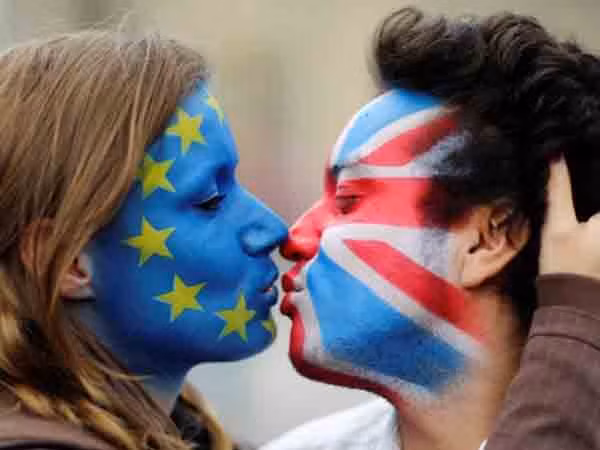 Đôi bạn trẻ vẽ cờ Anh và EU lên mặt để biểu thị sự ủng hộ ở lại ngôi nhà chung châu Âu