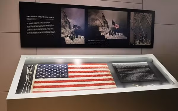 Lá cờ Mỹ được nhân viên cứu hỏa kéo lên tại địa điểm Tòa tháp Trung tâm thương mại thế giới vào thời điểm đó được trưng bày