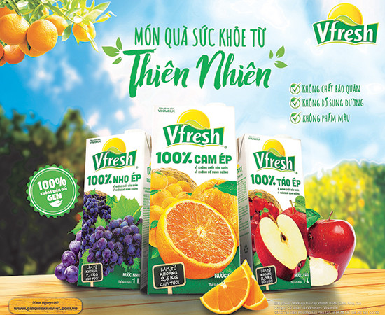 Vfresh hiện đang là nhãn hiệu nước trái cây đóng hộp dẫn đầu tại thị trường trong nước. Tất cả các sản phẩm dòng Vfresh 100% như nước cam ép, nước táo, nước nho, nước rau quả đều là nước ép 100% nguyên chất, không chất bảo quản, không biến đổi gen, không bổ sung đường. Nước trái cây 100% Vfresh đều được ép từ nguồn trái cây tươi ngon trên thế giới như cam Valencia, nho Tây Ban Nha. Với chất lượng cao như vậy, Vfresh cũng được phục vụ trên hãng hàng không 4 sao - Vietnam Airlines hạng thương gia nội địa và tất cả các hạng vé đối với đường bay quốc tế.