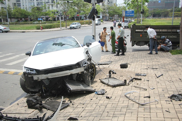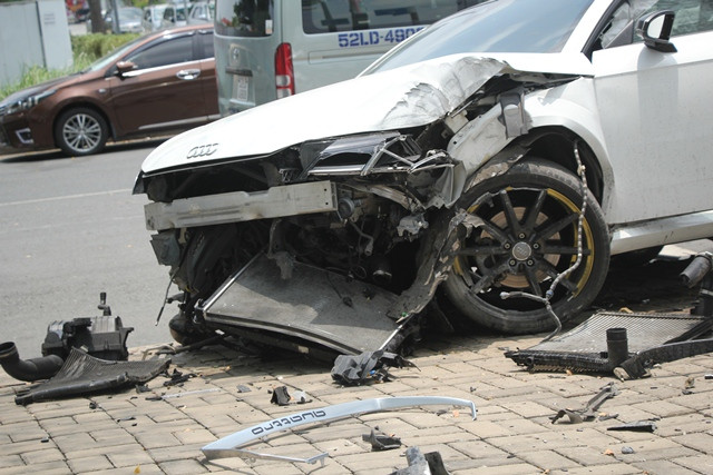 May mắn, hệ thống túi khí trên chiếc Audi bung ra, tài xế thoát ra ngoài, trên người không xây xát. Tại hiện trường, phần đầu xe Audi trị giá hơn 3 tỷ nát bươm, nhiều mảnh vỡ văng tung tóe trên vỉa hè.
