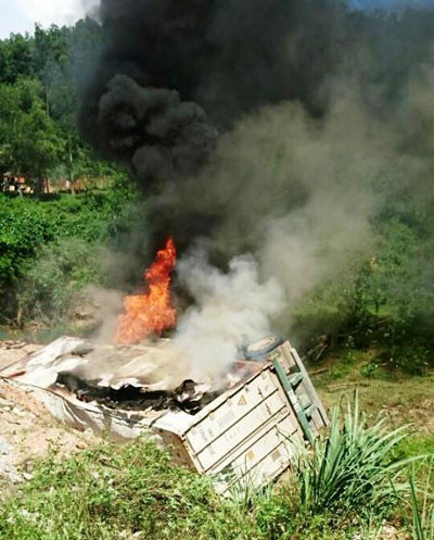 Khi đang đổ dốc, chiếc xe bị mất phanh rồi lật nhào xuống hố và bốc cháy, tài xế không thoát ra kịp, tử vong.