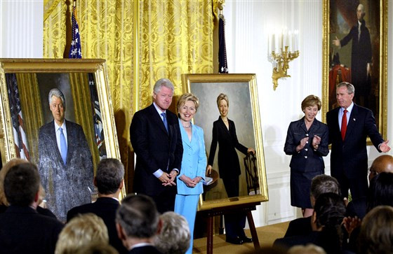 Vợ chồng cựu Tổng thống Bill Clinton bên các bức chân dung được người kế nhiệm trang trọng bày tại Nhà Trắng hôm 14-6-2004