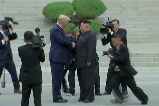 Hai nguyên thủ Mỹ và Triều Tiên sau đó cùng nhau bước qua vạch biên giới lần nữa, bước vào lãnh thổ Hàn Quốc tại khu vực phi quân sự (DMZ), nơi họ cùng Tổng thống Hàn Quốc Moon Jae-in tham gia cuộc gặp ba bên.