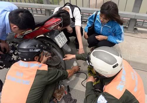 Vá xe miễn phí hỗ trợ người tham gia giao thông trên cầu Nhật Tân