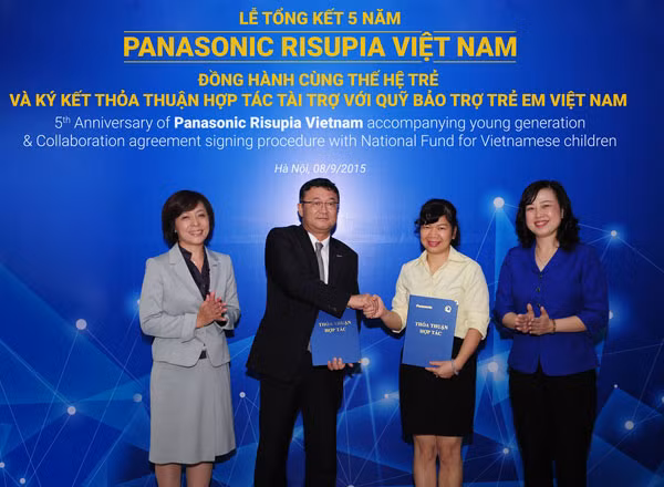 Ông Eiji Fukumori, TGĐ Panasonic VN và bà Lê Tuyết Mai, Phó Giám đốc Quỹ bảo trợ trẻ em Việt Nam trao thỏa thuận hợp tác tài trợ năm 2015