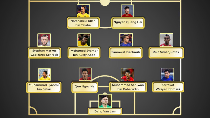 Đội hình tiêu biểu: Đặng Văn Lâm, Korrakot, Baharudin, Quế Ngọc Hải, Safari, Simanjuntak, Sanrawat, Kutty Abba, Schrock, Quang Hải, Talaha.