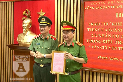 Với thành tích khám phá chuyên án mang bí số VA010V, bắt giữ hai đối tượng vận chuyển trái phép 39 bánh heroin từ Sơn La về Hà Nội đi Cao Bằng của CAQ Thanh Xuân, ngày 26/4, CATP Hà Nội đã tổ chức trao Thư khen của Giám đốc CATP cho 2 tập thể và 15 cá nhân có thành tích xuất sắc.