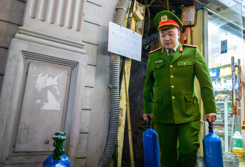 Khoảng 20h30 ngày 11-3-2023, lực lượng chức năng bất ngờ kiểm tra kho hàng trên, phát hiện bên trong tập kết 10 bình khí N2O loại nhỏ. Chủ cơ sở này là Đặng Hoàng Vũ, SN 1991, trú tại số 22 Lương Ngọc Quyến, phường Hàng Buồm khai nhận, toàn bộ số bình “khí cười” này mua trên mạng xã hội Facebook về bán lại kiếm lời.