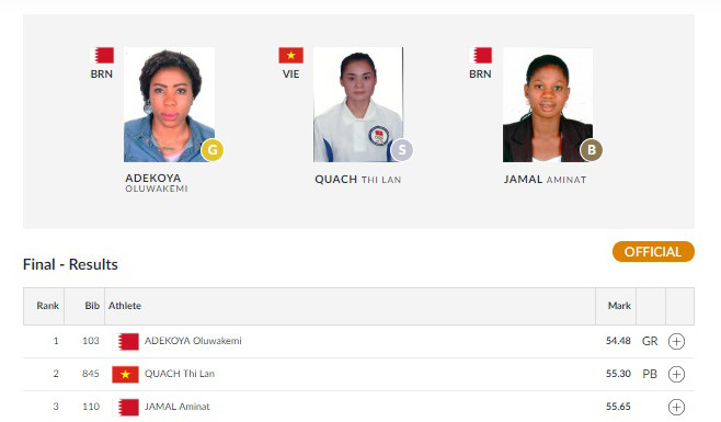 Trong khi đó, Quách Thị Lan của Việt Nam cũng rất xuất sắc khi cán đích với thành tích 55 giây 30, giành HCB ASIAD, đồng thời phá sâu kỷ lục SEA Games, kỷ lục quốc gia do chính mình xác lập trước đó một ngày.