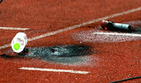 Mặt đường piste sân Mỹ Đình cháy sém bởi rất nhiều pháo sáng do cổ động viên Hải Phòng ném xuống