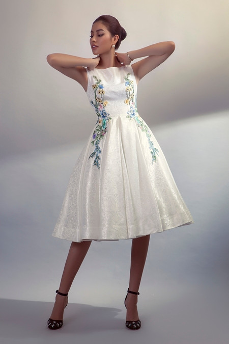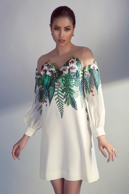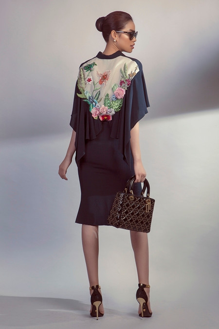 Những bông hoa bằng chất liệu thêu 3D được tiết giảm so với bộ sưu tập trình diễn trên catwalk, gần gũi và ứng dụng hơn nhưng vẫn toát ra một cá tính rất riêng cho người mặc. Trong một look phối hợp áo sơ mi lụa và chân váy bút chì, phần tay áo được cắt thành bèo rũ chạy dọc phần lưng sau được phối organza trắng để làm nổi bật những bông hoa thêu 3D đa sắc và sống động. Nhìn ở trước mặt người đối diện sẽ khó lòng nhận ra nhưng khi quay lưng lại sẽ tạo sự bất ngờ thú vị.