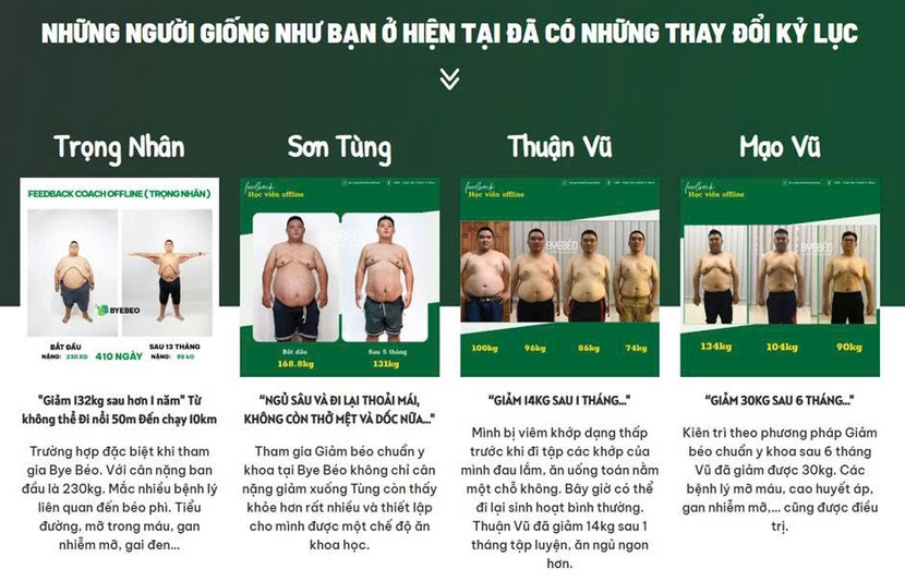 Đa số người tiêu dùng áp dụng Bye Béo đều ghi nhận kết quả tích cực. Họ không chỉ giảm cân mà còn cải thiện sức khỏe tổng thể và tinh thần nhờ chế độ ăn uống khoa học, bài tập phù hợp và sự hỗ trợ từ đội ngũ chuyên gia. Nhiều học viên cho biết sau khi kết thúc chương trình, họ vẫn duy trì được vóc dáng, chứng tỏ hiệu quả bền vững của phương pháp.
