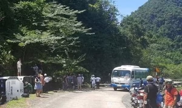 Kết quả xác minh ban đầu, đây là xe chở đoàn cựu học sinh trường THPT Đồng Hới, tỉnh Quảng Bình tham gia kỷ niệm 30 năm ngày ra trường, đang trên đường đi vào hang Tám Cô thì bị lật.