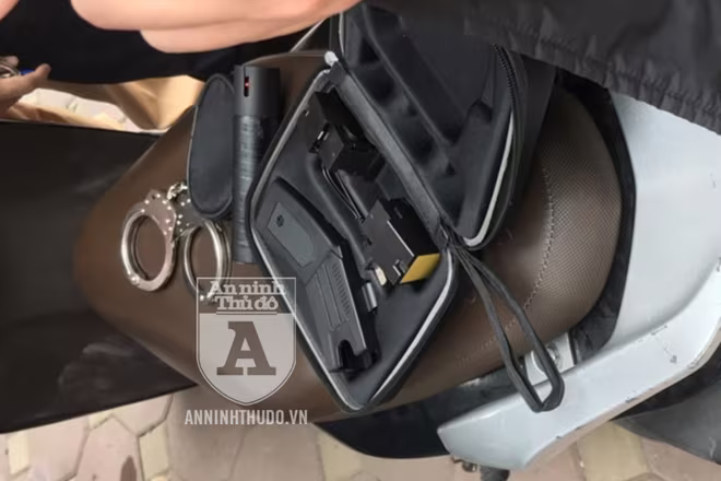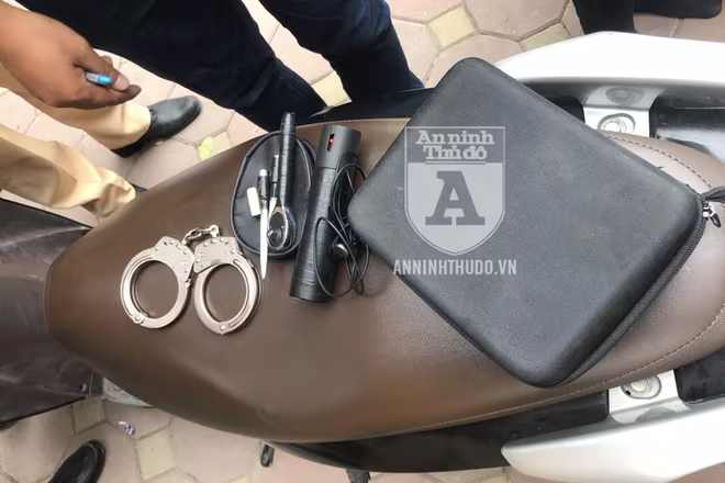 Trong đó, cảnh sát thu được 1 bình xịt hơi cay màu đen trên người Tú, 1 dao gấp màu bạc cùng bộ vam phá khóa xe máy (gồm 1 tay công và 2 đầu vam) trên người Hoàng. Tiếp tục kiểm tra chiếc xe Vision, cảnh sát thu được 1 khẩu súng phóng điện và 1 còng số 8.