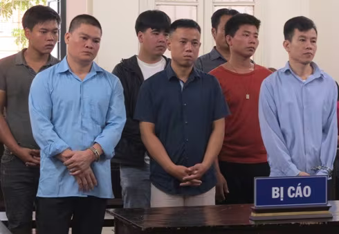 Bị cáo Nguyễn Tuân (đứng giữa, hàng trên) và các đồng phạm tại phiên tòa.