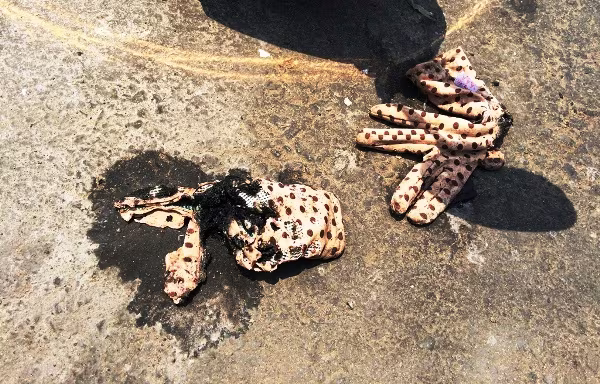 Tại hiện trường, chiếc xe máy của hai cô gái nằm giữa đường, bên cạnh là đôi găng tay bị bốc cháy.