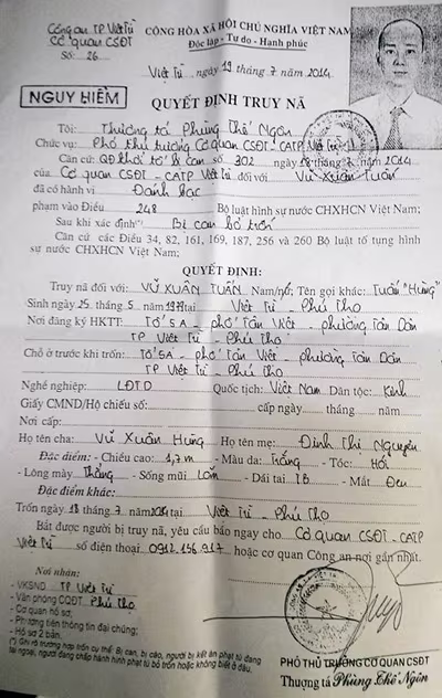 Cơ quan CSĐT - CATP Việt Trì, tỉnh Phú Thọ ra quyết định truy nã Nguyễn Xuân Tuấn