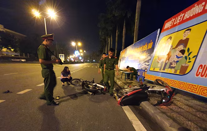 Đáng chú ý, vào cùng thời điểm trên, tại đường Hai Bà Trưng (phường Đống Đa, TP Vĩnh Yên), xe mô tô không biển kiểm soát, nhãn hiệu Honda, Wave alpha, màu sơn trắng do Nguyễn Quang Hùng điều khiến, chở Nguyễn Văn Hải (đều sinh năm 2002), cùng ở xã Thiện Kế, huyện Bình Xuyên và xe mô tô biển kiểm soát: 88G1-026.03, do Nguyễn Thành Trung chở Nguyễn Quang Huy (sinh năm 2003, ở xã Thiện Kế, huyện Bình Xuyên) tham gia đoàn các đối tượng điều khiển xe lạng lách, đánh võng, không chấp hành hiệu lệnh của Cảnh sát giao thông và lực lượng chức năng đã đâm vào đồng chí Hà Công Tú (cán bộ Đội Quản lý hành chính) và đồng chí Nguyễn Đình Khải (cán bộ đội Cảnh sát giao thông), Công an thành phố Vĩnh Yên.